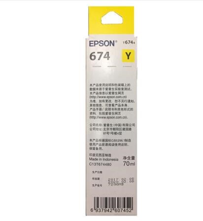 • 商品名称:爱普生(Epson)T6744黄色墨水补充装 C13T674480(适用于L801)