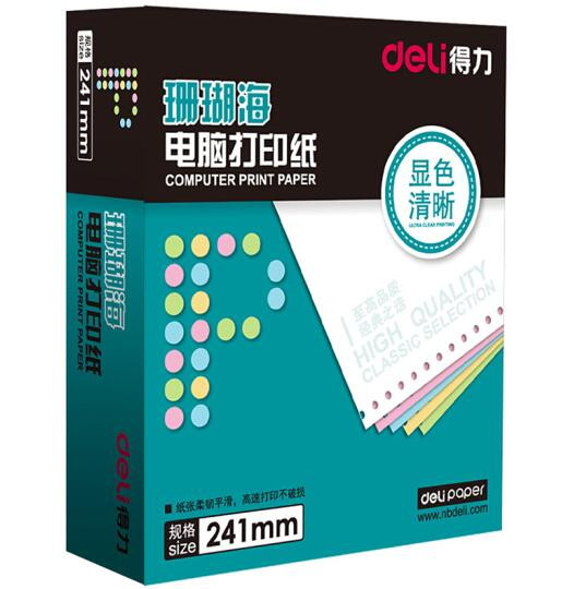 • 商品名称:得力(deli)珊瑚海彩色电脑打印纸S241-4-1/3CS四联三等分80列(撕边 色序:白红蓝黄 1000页/箱)