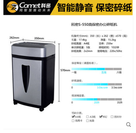 • 商品名称:科密S550碎纸机办公大功率静音粉末状米粒2mm*2mm保密粉碎机