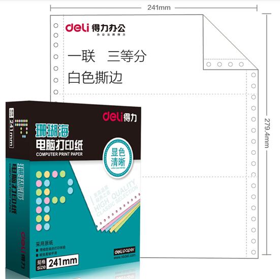 • 商品名称:得力(deli)珊瑚海S241-1-1/3S一联三等分 80列撕边 白色电脑打印纸( 1000页/箱)